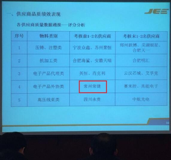 本次大會以“合作發展”為主題,聚焦“匠心精神”,會上深情回顧了“江淮巨一”2016年發展目標及完成情況,以及對供應商質量管理工作的績效。同時結合當前形勢,提出了2017年的質量提升計劃,并在2016年采購基礎上,展示了2017年采購工作計劃。在2016年供應商品質績效評價中,CJE在電子產品外協類中被評定為前1-2名的供應商,這是JEE對CJE電容器品質的肯定。